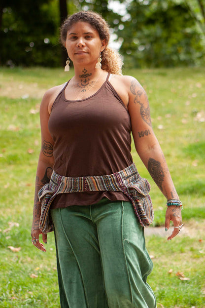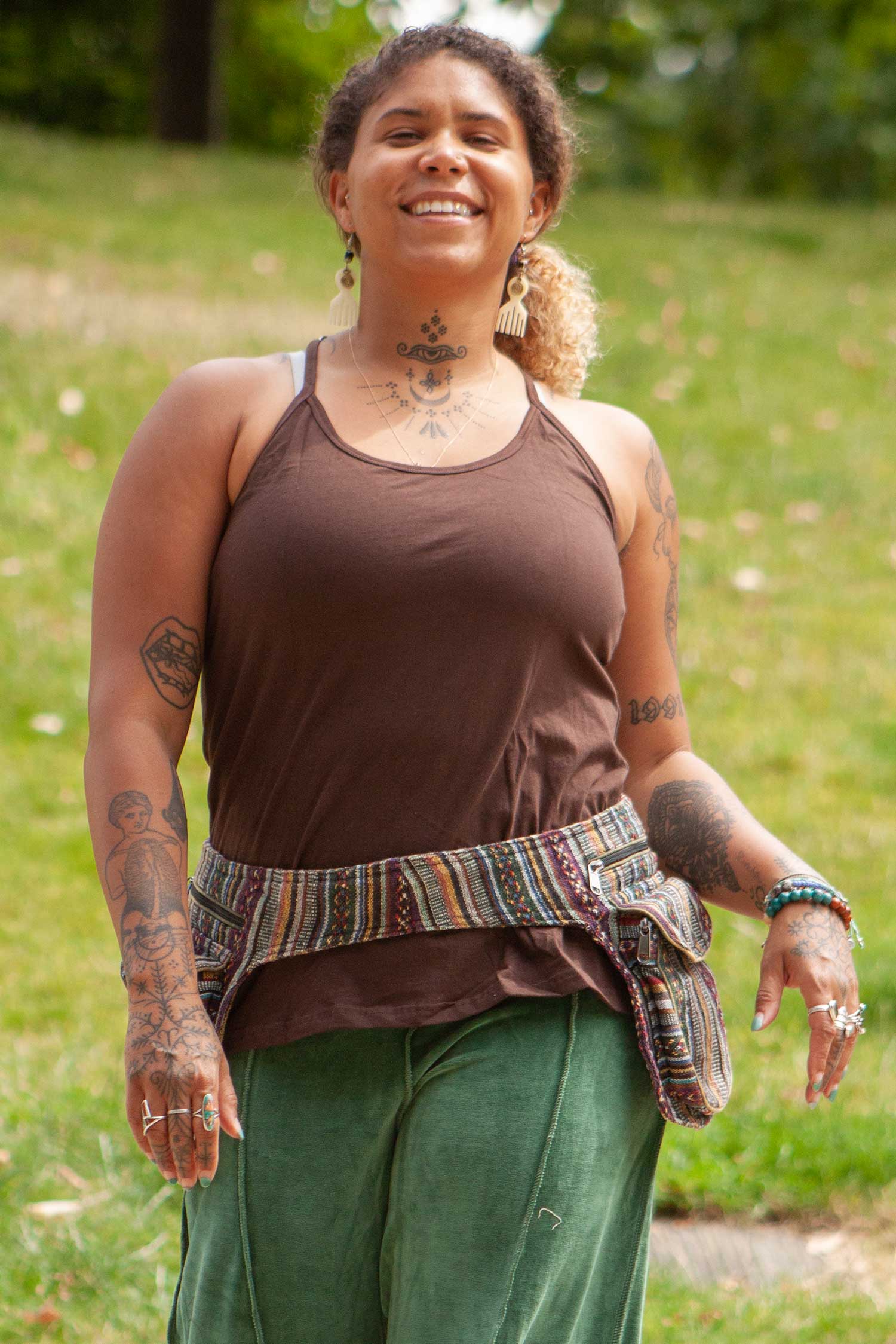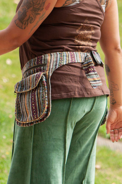 Are you looking for a roomy, sturdy waist bag for all your festival bits and pieces? This is a double pocket belt made of woven Nepali gheri cotton. It fastens with a plastic buckle. It has five pockets in total, two one each side plus a hidden one on the back of one of the sides. Each side has a zippered section measuring 8 x 6" Underneath the zip section is a pocket a flap with a magnet button on it and also a zipper, and measures 6 x 6.5 x 1.3". Inside the belt on one side is a hidden zippered section measuring 5.5 x 8".