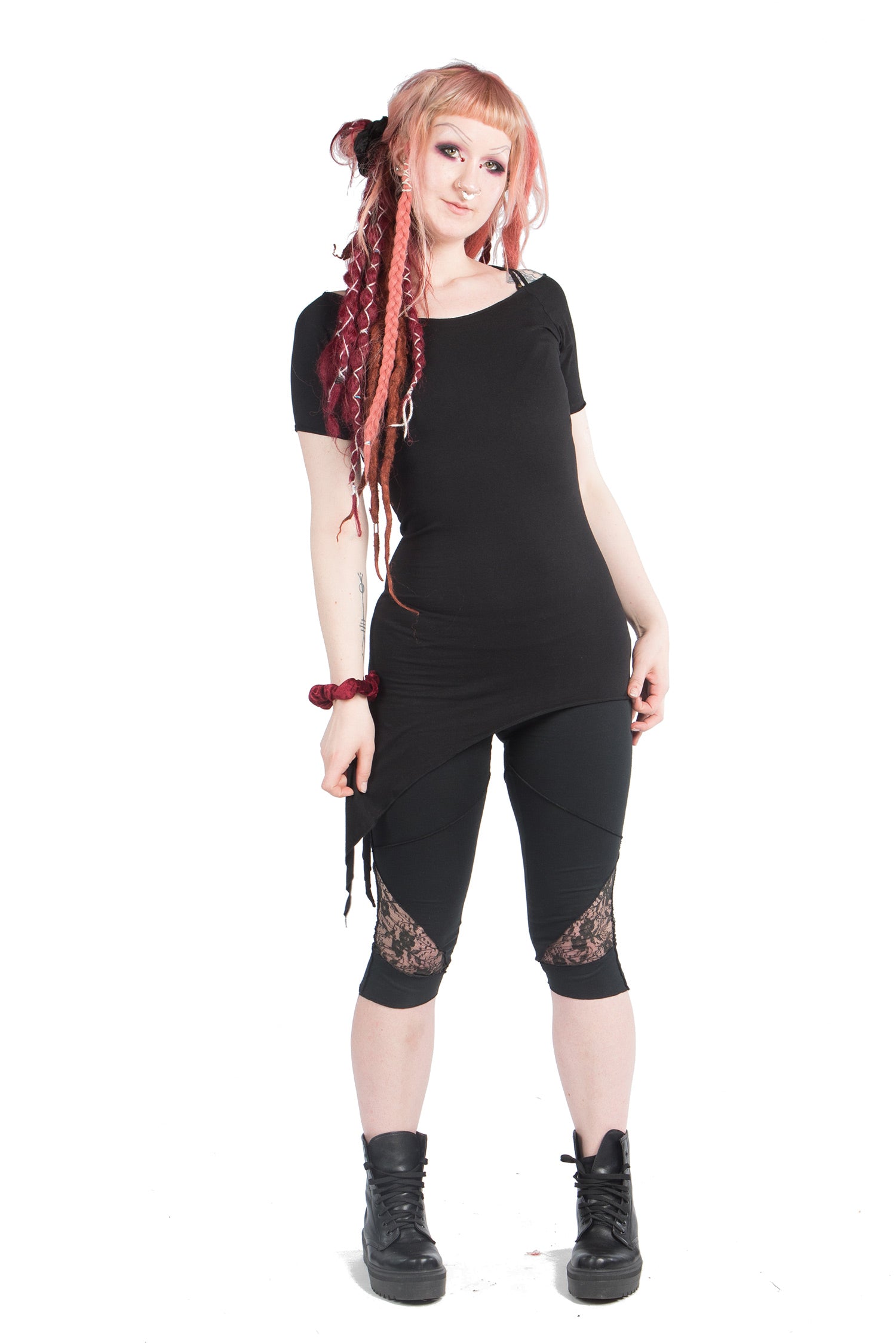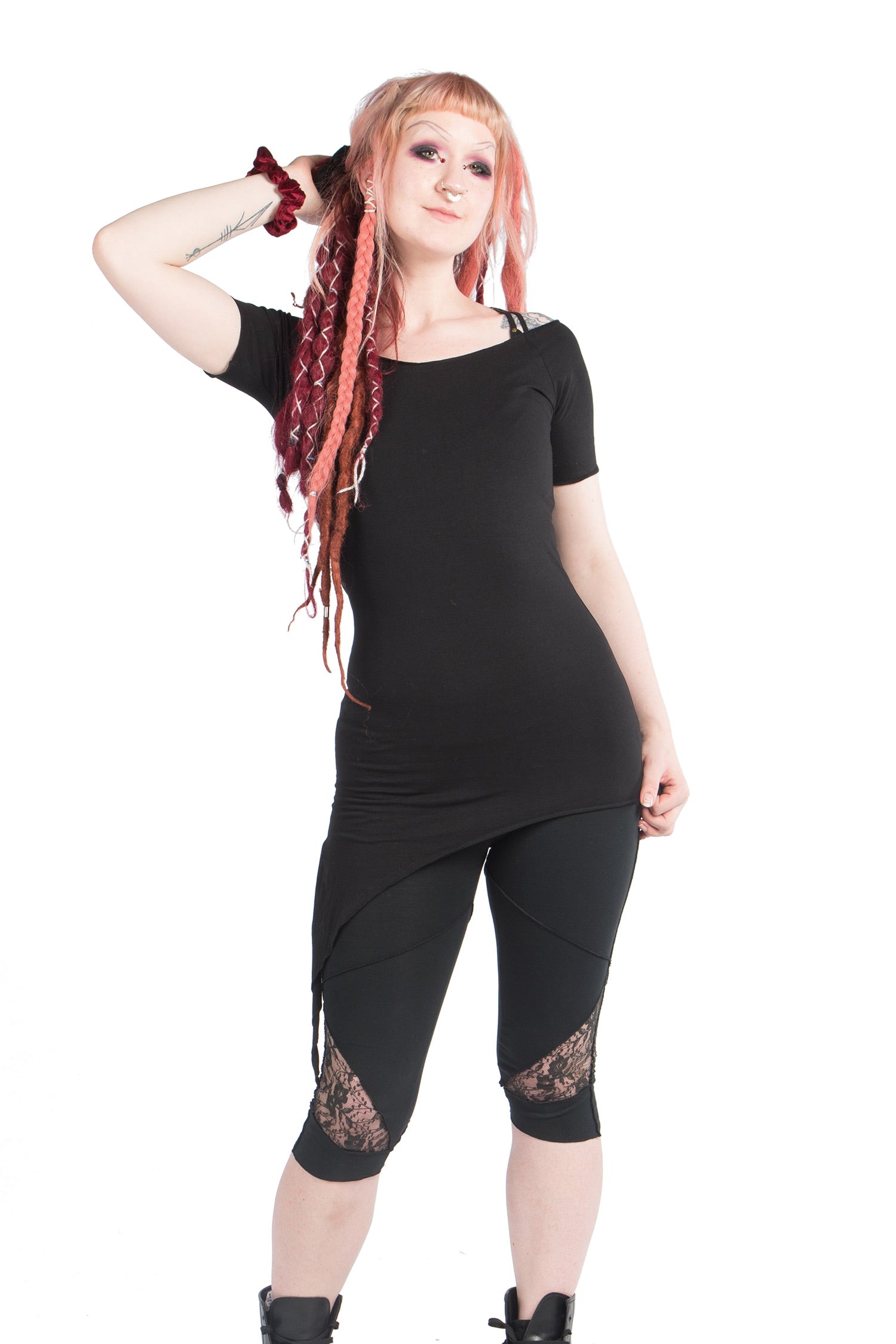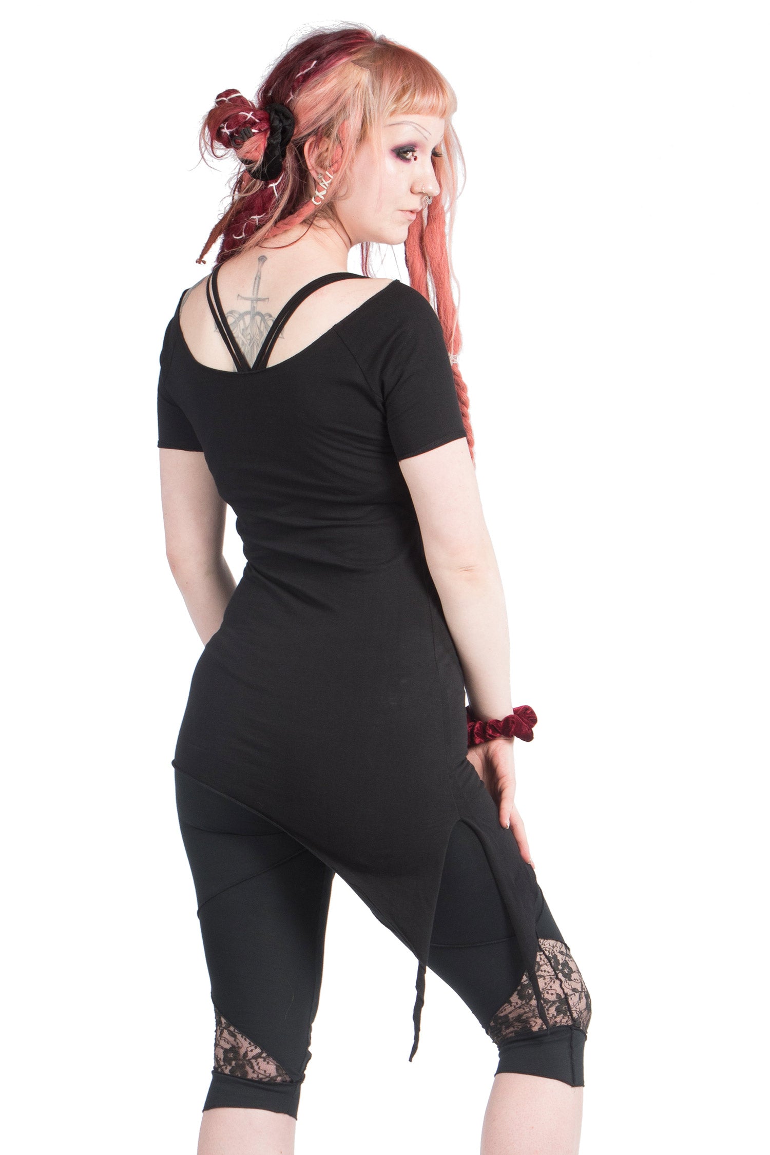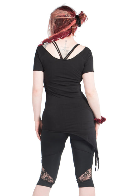 Flatteringly cut tee top with asymmetrical points at the hem and a wide scoop neckline.