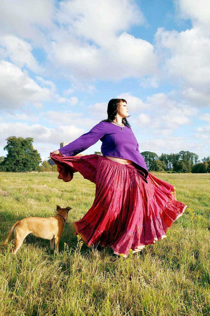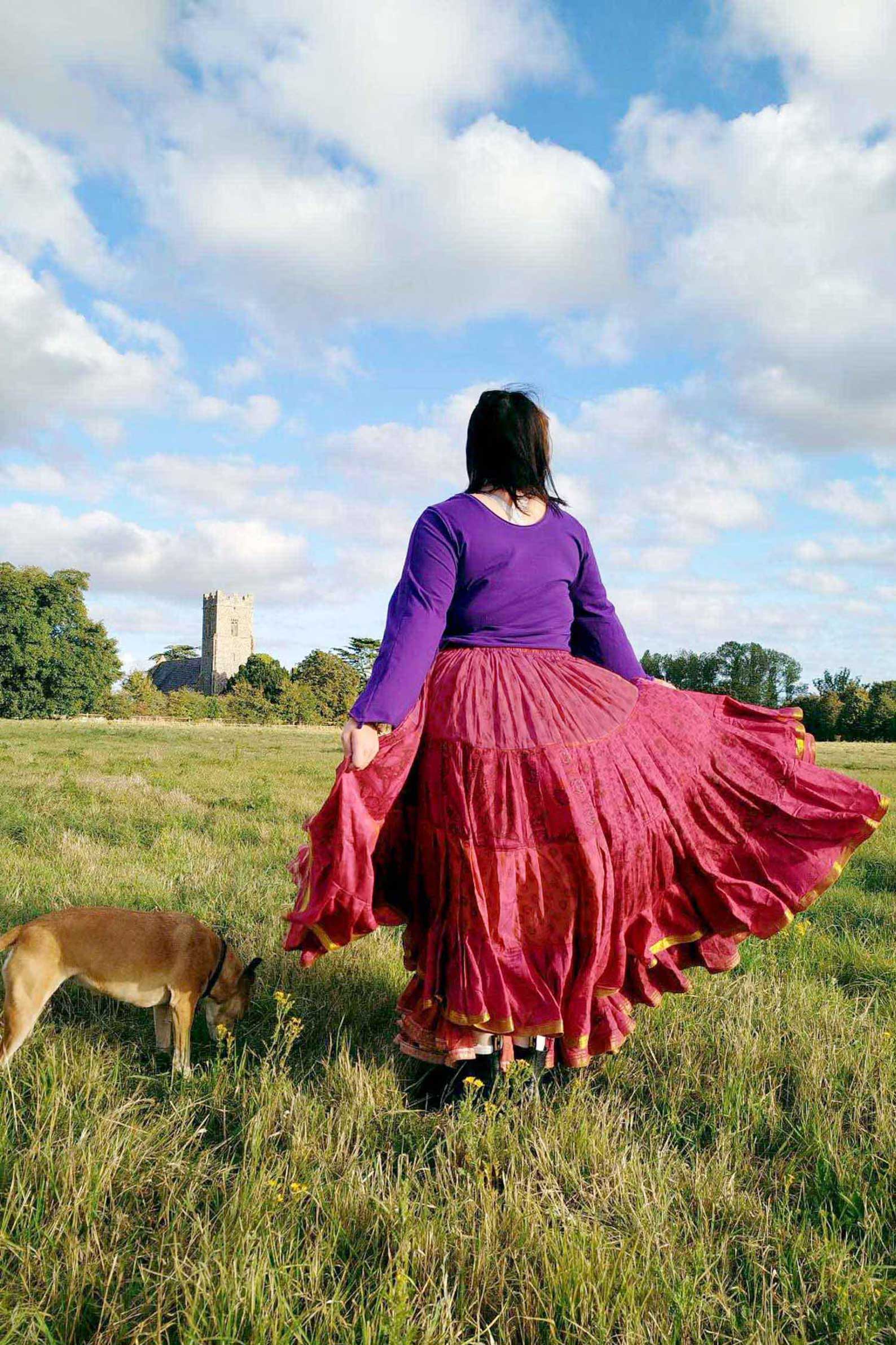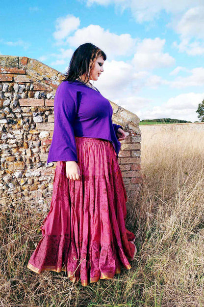 This long, four-tiered skirt is made from the beautiful silk fabric of four vintage saris.