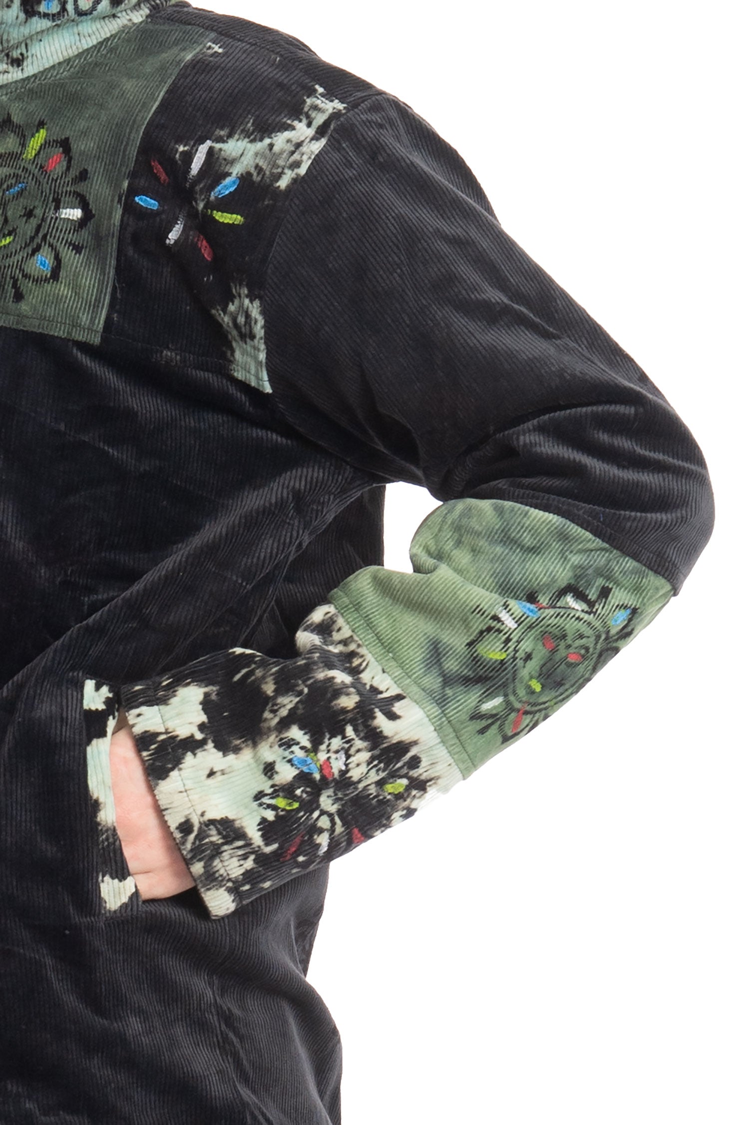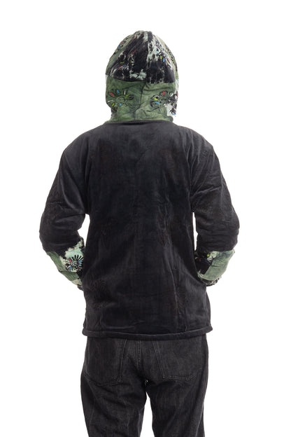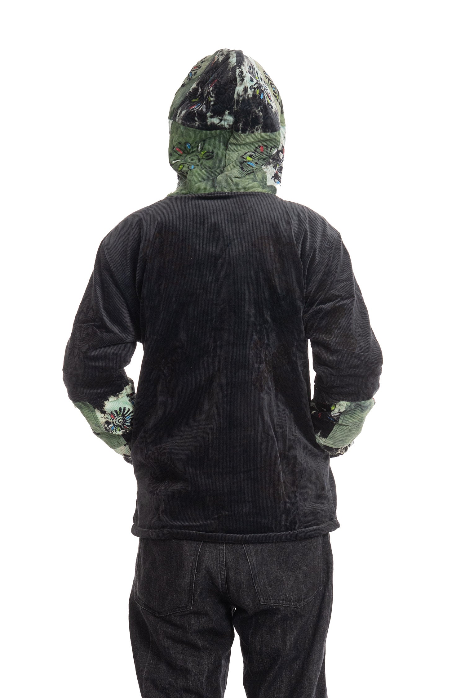 A unisex hoodie jacket made of black and tie dye corduroy with hand block print designs all over.